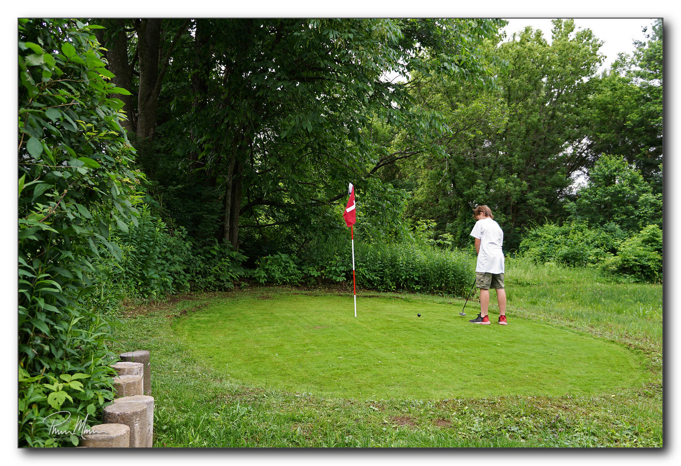 After a short while, I realized that we needed to do some groundskeeping so I pulled out both mowers and a rake so we could clean-up the putting green. I still have to remove some small ridges around the putting green but I'll do that after our time with Lukey and Kenzie. Leveling out those ridges will produce bare dirt again in those areas surrounding the green so I'll need another two to three weeks for grass to grow and mature. That small project can wait until Lukey and Kenzie have gone back home...